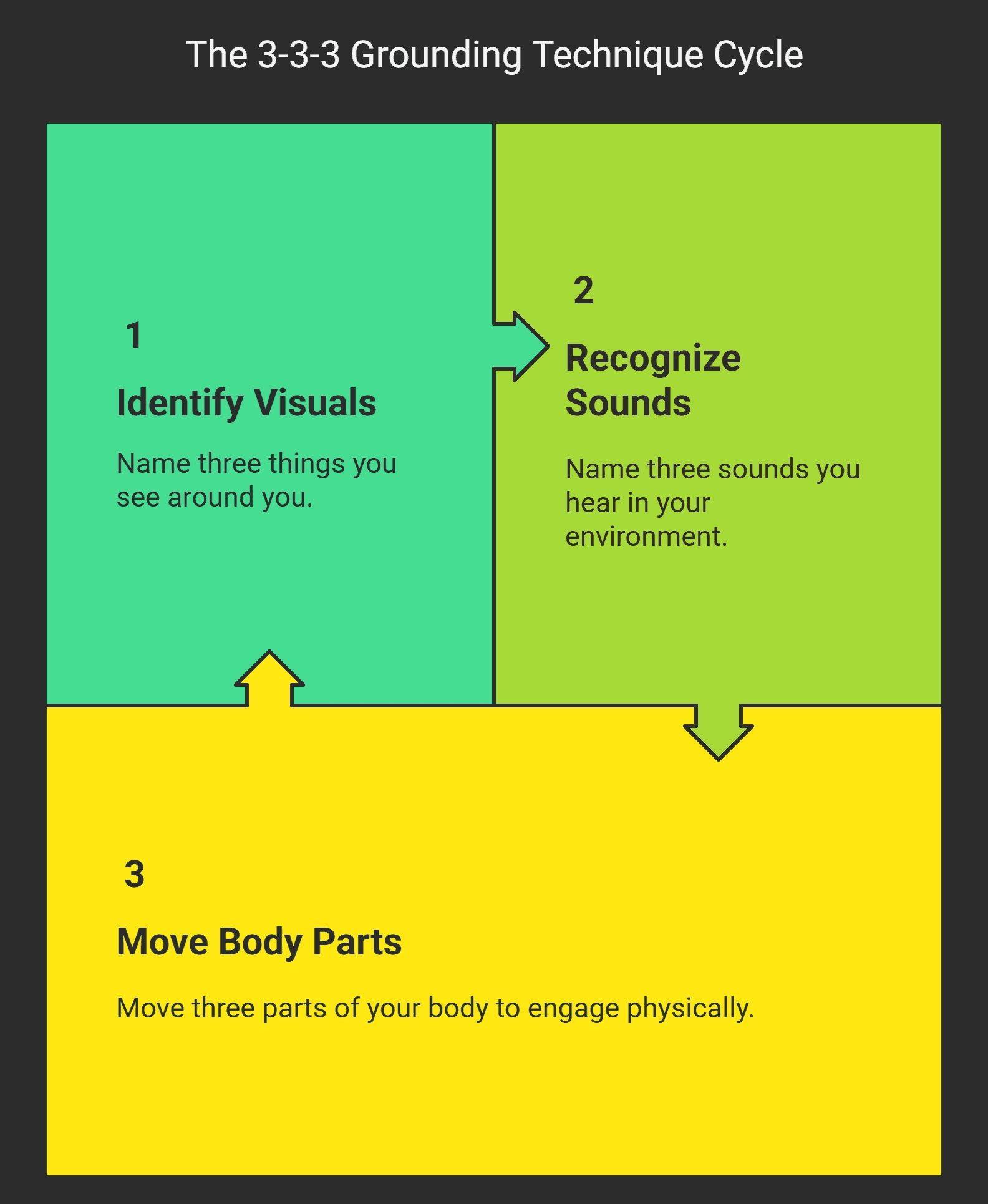 The 3-3-3 rule is a simple grounding technique to reduce anxiety. When you feel anxious: