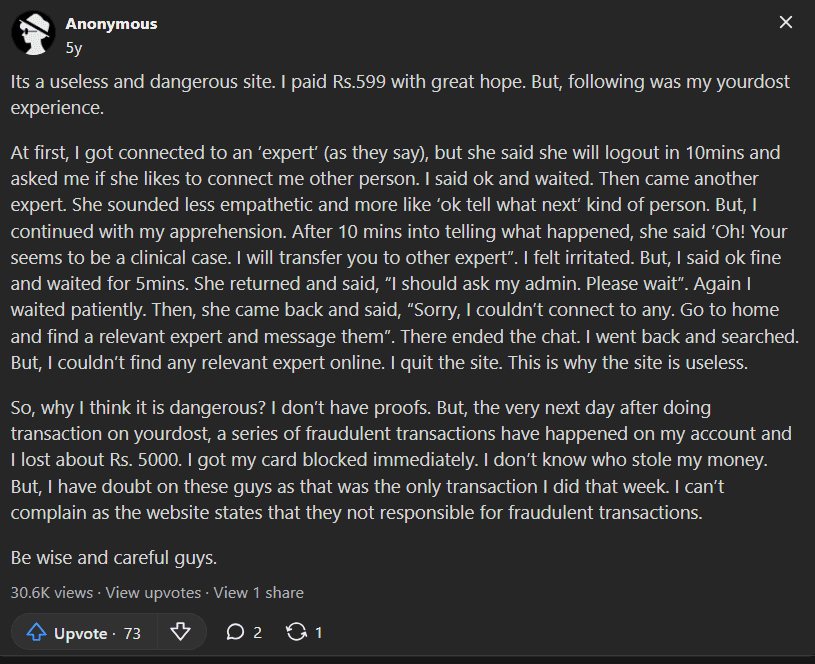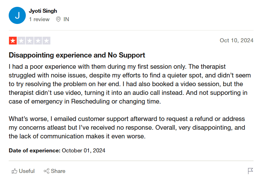 Expensive Subscription Model – Therapy costs between INR 5,415 and 7,429 per week, making it significantly pricier than many other platforms.