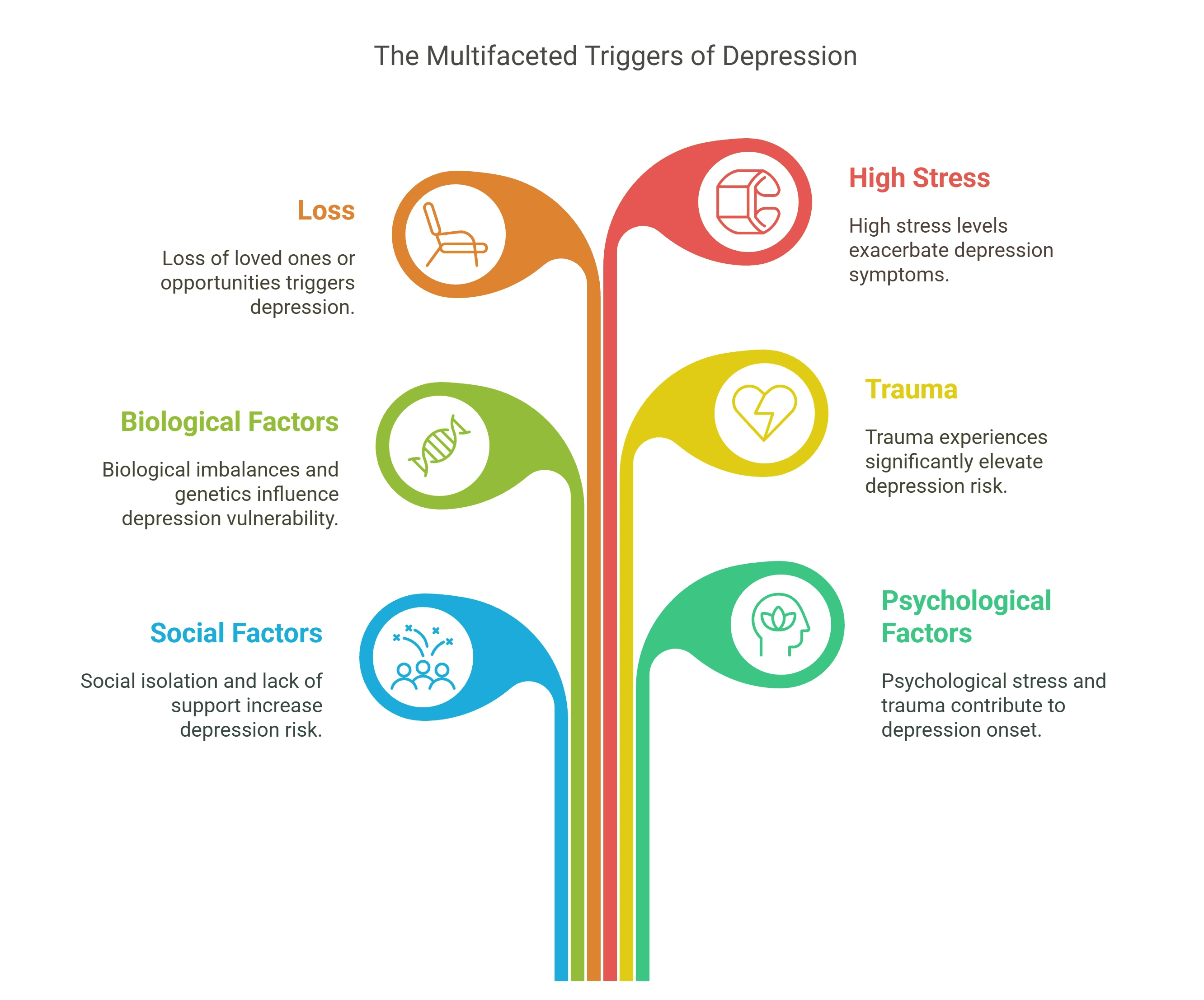 Depression can be triggered by a mix of social, psychological, and biological factors. Experiences like trauma, loss, or high stress - whether at work, school, or in personal life - can increase the risk of developing it.