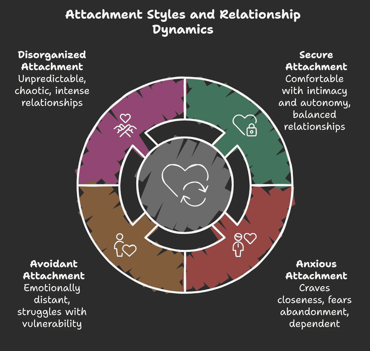 Rooted in fear and inconsistency, this style combines both anxious and avoidant tendencies. People with disorganized attachment may be drawn to relationships that replicate the unpredictability of their early caregiving experiences, which can create chaotic, emotionally intense, or abusive cycles.