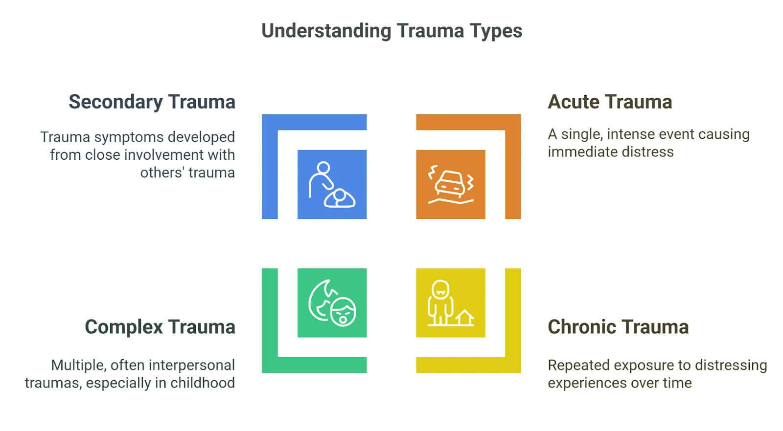 Trauma can be categorized in different ways based on how and when it occurs. Here are the most common types: